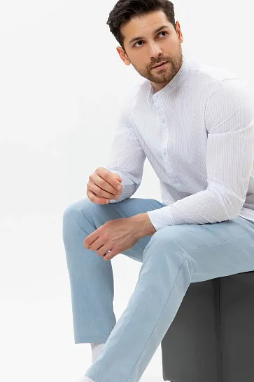 1. Классические брюки официального стиля — подойдут для работы в офисе, посещения торжественных вечеринок. Они гармонируют с поло, рубашками, пиджаками, лоферами и классическими туфлями, являются частью костюмов. Они элегантные, прямые, с высокой посадкой талии, умеренно широкими штанинами, длиной до каблука. Спереди брюки аккуратно укладываются на туфли и образуют залом. Карманы в подобных моделях в меру глубокие и удобные.